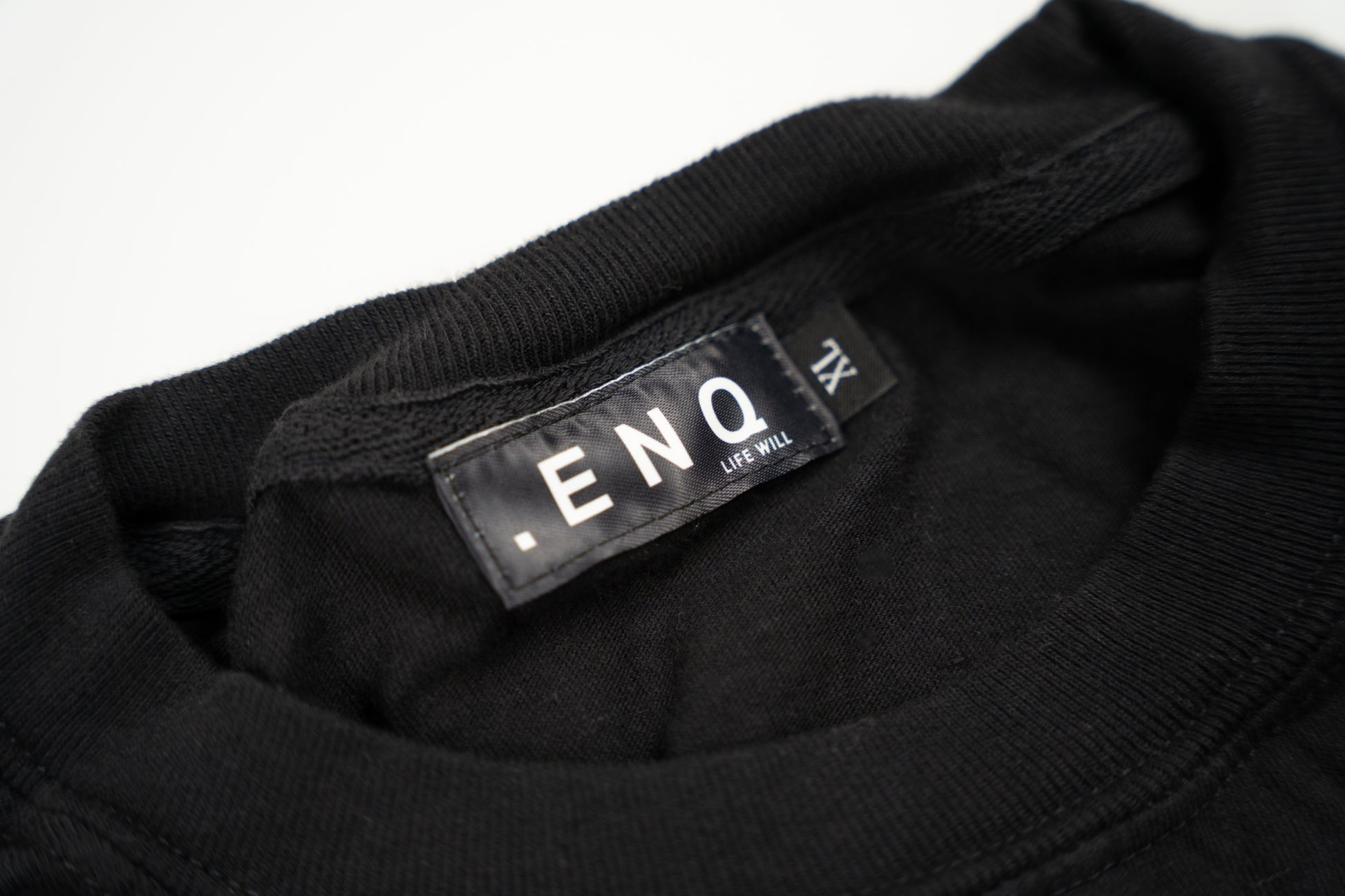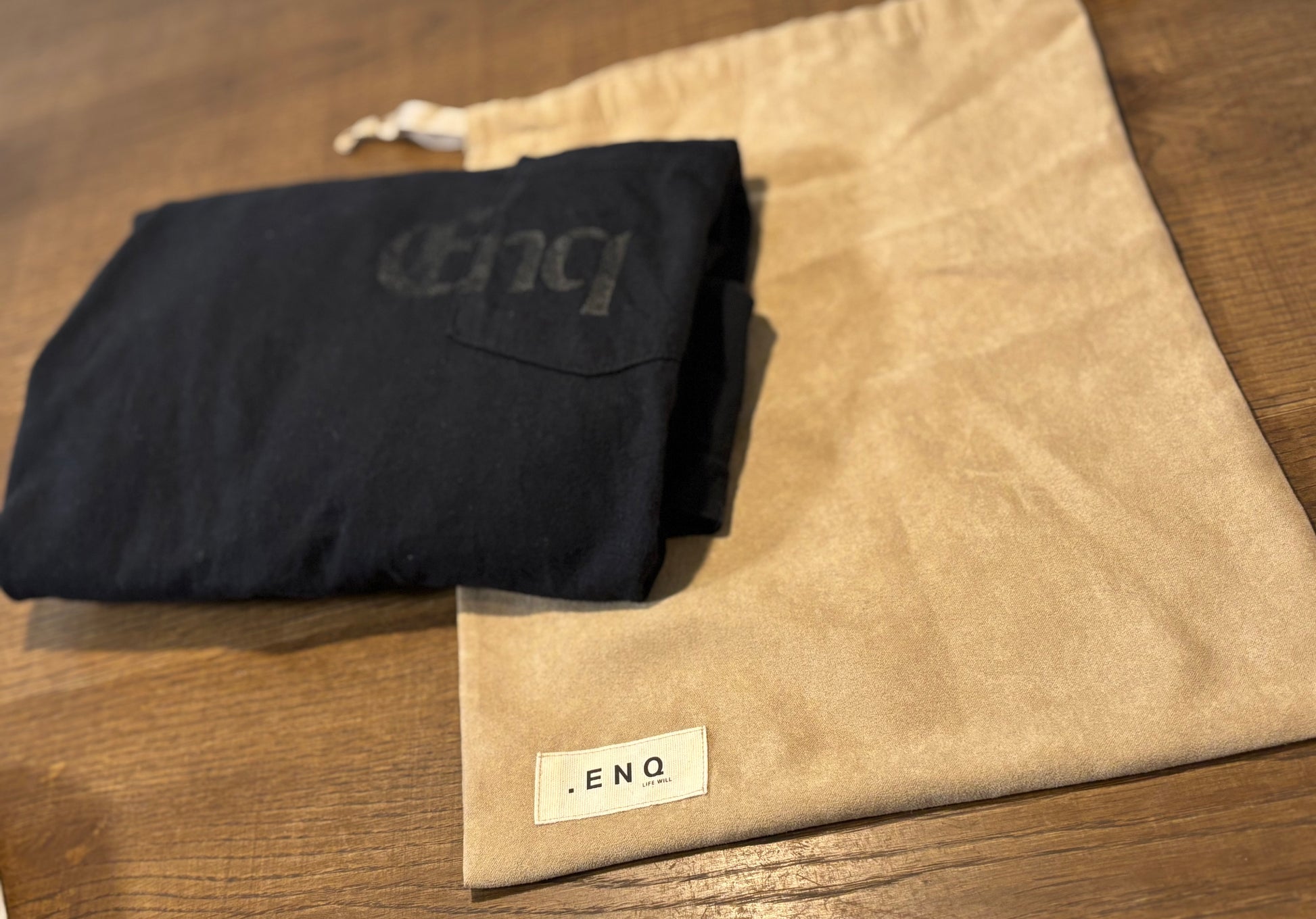ポケット位置に生地と同色で「Enq」をプリント。