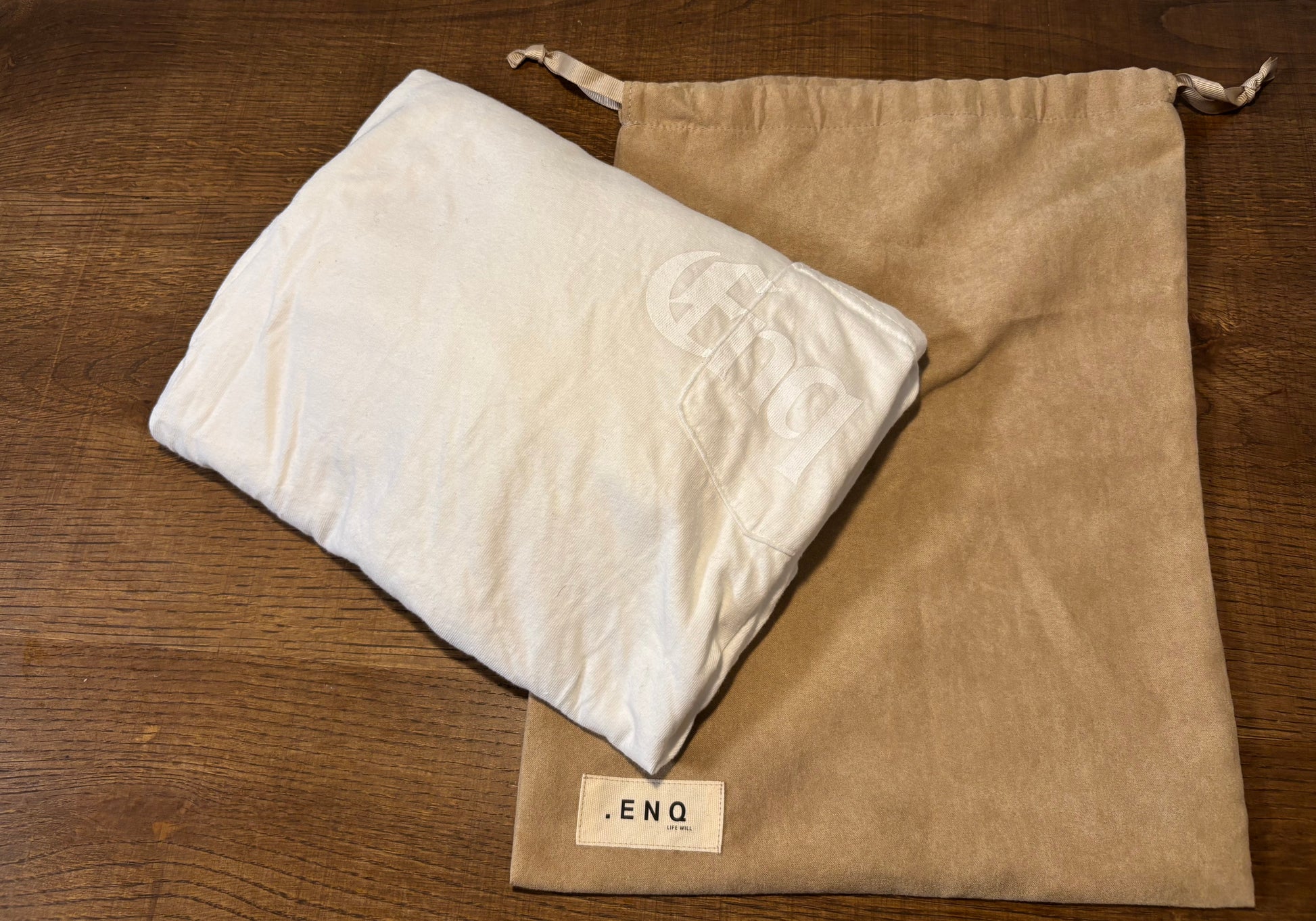ポケット位置に生地と同色プリントで「Enq」を配置。