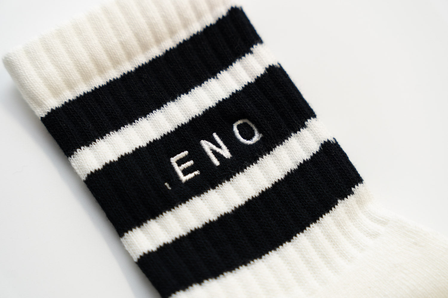 シンプルで存在感のあるロゴデザインが特徴のラインソックス。程よい厚みとリブ編み仕様で履き心地とフィット感を両立。